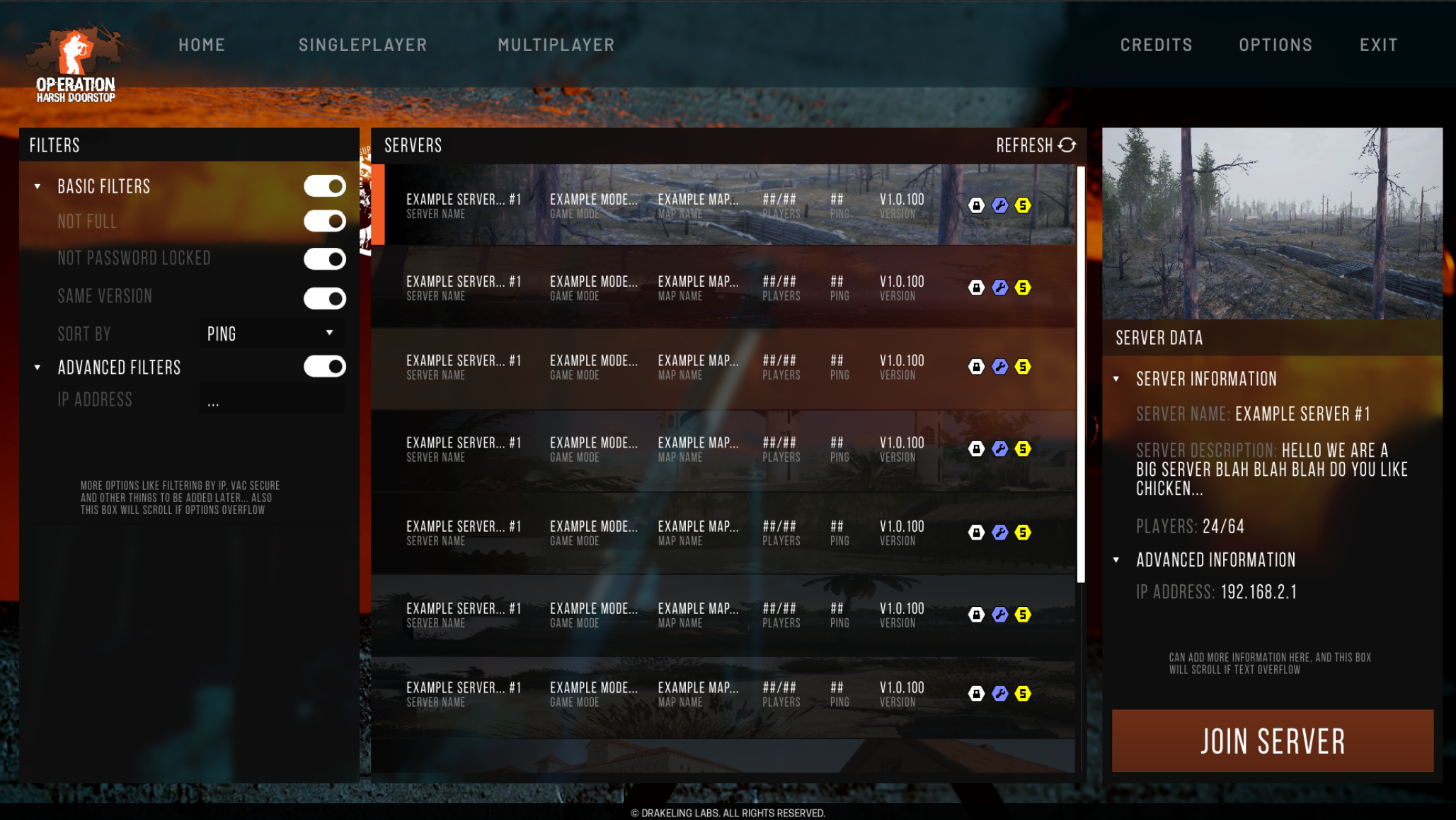 The first image depicts roughly how the main menu will depict donator status, as well as ownership badges of the various WIP content expansions. The second image is what our new multiplayer server browser will look like, complete with filters, server listings and icons, and server descriptions. The third image is what our new options menu will look like. As you can see, we are essentially repurposing what the current singleplayer menu layout offers, as we feel this system works quite well and is rather easy to navigate and use while still being able to compartmentalize the various submenus and settings/options in a way that is intuitive and makes sense.