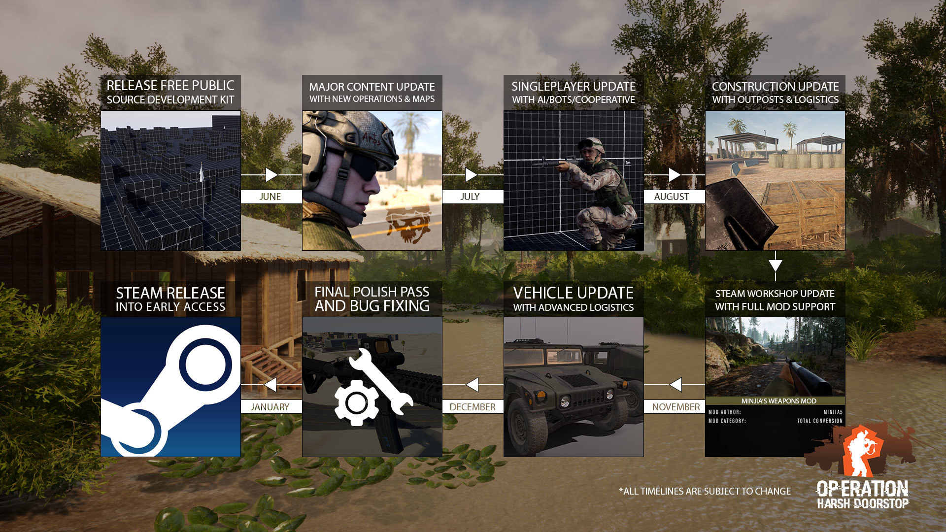 First up, we wanted to make sure to reiterate the tentative roadmap/schedule of the planned updates and major features that the team is focused on creating leading up to a Steam Early Access release: